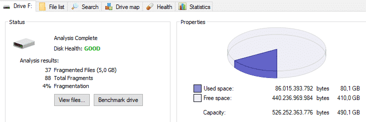 Jeg prøver at lade være med at slette papirkurven, og får efter kort tid at vide, at health for mit F-drev ser sådan ud: