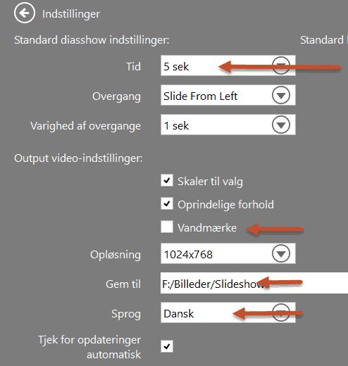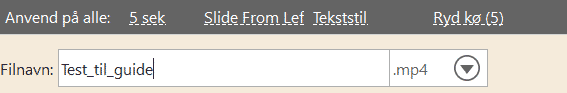 Nu har du en stribe billeder i højre side af skærmen. Jeg synes, det er en fordel at ændre filnavnet, så filen kan genkendes og filtypen til mp4, som vist er den mest udbredte type? Herunder sætter jeg tiden til fem sekunder og overgangene til “Tilfældig”.
